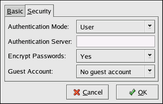 Server — The Samba server tries to verify the username and password combination by passing them to another Samba server. If it can not, the server tries to verify using the user authentication mode. Specify the NetBIOS name of the other Samba server in the Authentication Server field.
